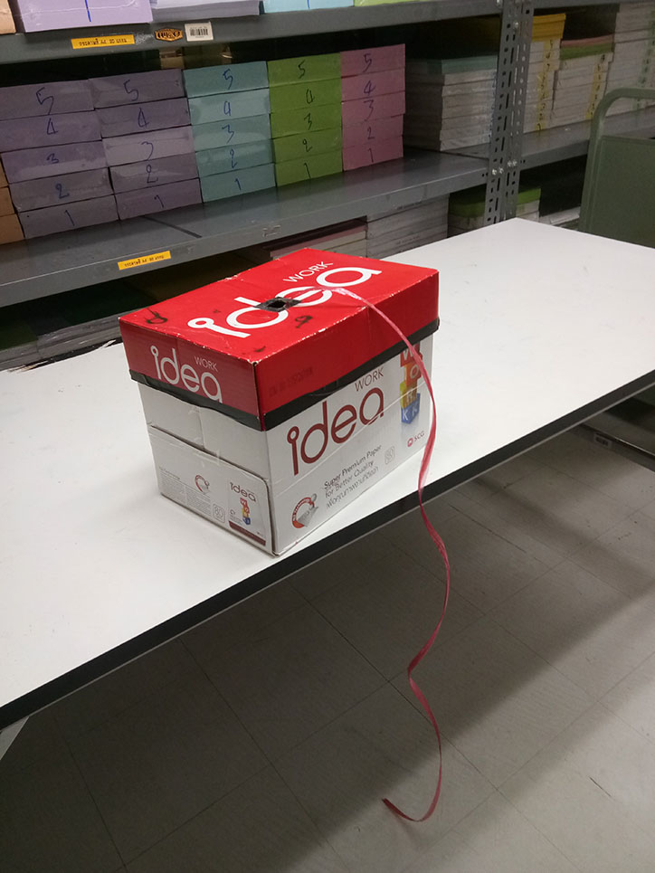 ที่ใส่เชือกสำหรับมัดซองใส่ซองสำเนาข้อสอบ ประดิษฐ์จากลังกระดาษ A4 เจาะช่องให้ปลายเชือกโผล่มาเพื่อสะดวกในการดึงเชือกมาใช้งานผลงานของ คณะทำงานผลิตสำเนาข้อสอบงานออกแบบและผลิตสื่อสิ่งพิมพ์