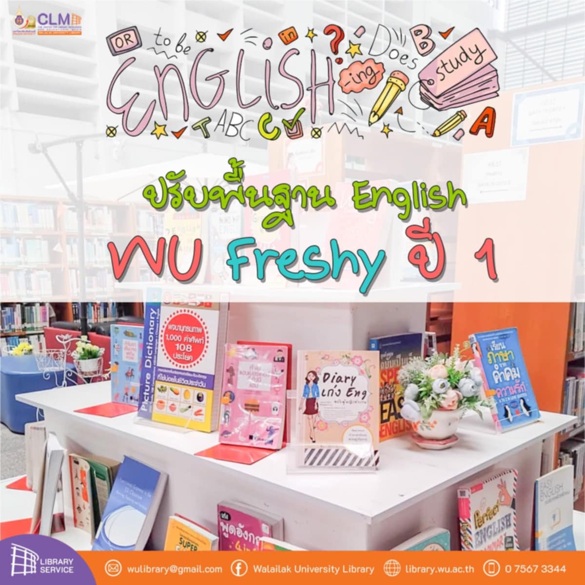ระหว่างวันที่ 13 พฤษภาคม – วันที่ 4 มิถุนายน 2568 ห้องสมุดชั่วคราว ศูนย์บรรณสารและสื่อการศึกษา อาคารสถาปัตยกรรมและการออกแบบ ได้สนับสนุนสื่อการเรียนรู้ด้านภาษาอังกฤษในโครงการ Pre – English สำหรับ นศ.ชั้นปีที่ 1 และนักศึกษาที่สนใจ โครงการดังกล่าวจัดโดยสำนักวิชาพหุภาษาและการศึกษาทั่วไป ด้วยตระหนักถึงบทบาทสำคัญในการสนับสนุนการปรับพื้นฐานภาษาอังกฤษของนักศึกษาใหม่ ชั้นปีที่ 1 โดยได้จัดพื้นที่การเรียนรู้ ได้แก่ Collection PE1131 และมุม GenEd Corner เตรียมพร้อม และยังมีบริการค้นตัวเล่ม Delivery หลังสมาชิกค้นรายการหนังสือจากฐานข้อมูลทรัพยากรสารสนเทศของศูนย์บรรณสารฯ จากเว็บไซต์ https://library.wu.ac.th/ ซึ่งเป็นเว็บไซต์หลักของศูนย์บรรณสารและสื่อการศึกษา คลิกเลือก WU resources บริการสืบค้นทรัพยากรของศูนย์บรรณสารและสื่อการศึกษา (OPAC) ระบบจะเข้าหน้า Book search ให้กรอก PE1131จะพบหนังสือที่เกี่ยวข้องทั้งหมด 60 ชื่อเรื่อง ผู้ใช้ที่เป็นนักศึกษาชั้นปีที่ 1 สามารถยืมได้โดยต้องมาติดต่อเคาน์เตอร์ยืมคืน ที่ห้องสมุดชั่วคราว อาคารสถาปัตยกรรมศาสตร์ ฯ (เนื่องจากยังไม่มี Log in) สำหรับผู้ใช้บริการอื่นๆ ที่มี Log in แล้วสามารถใช้บริการ RD (Resources delivery) โดยคลิกที่สัญลักษณ์รถบรรทุก