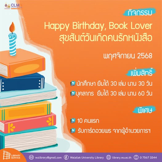 ห้องสมุดขอส่งความสุขให้แก่ผู้ที่ชื่นชอบการอ่านหนังสือ เป็นของขวัญวันเกิดสำหรับทุกท่าน “สิทธิพิเศษ” ในกิจกรรม Happy Birthday, Book Lover สุขสันต์วันเกิดคนรักหนังสือ”