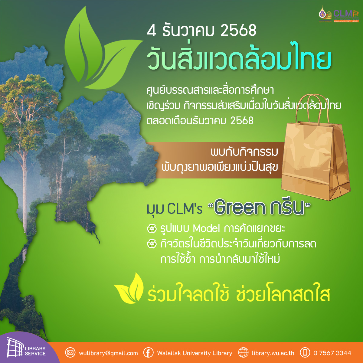 ศูนย์บรรณสารและสื่อการศึกษา มหาวิทยาลัยวลัยลักษณ์ ขอเชิญร่วม ‘กิจกรรมดี ๆ เนื่องในวันสิ่งแวดล้อม 4 ธันวาคม 2568 ที่ใกล้จะถึงในอีกไม่กี่วันข้างหน้านี้ ในฐานะเป็นสมาชิกเครือข่ายห้องสมุดสีเขียว ได้เตรียมจัดกิจกรรมเกี่ยวกับสิ่งแวดล้อมในวันดังกล่าว และตลอดช่วงเดือนธันวาคม 2568 ได้แก่