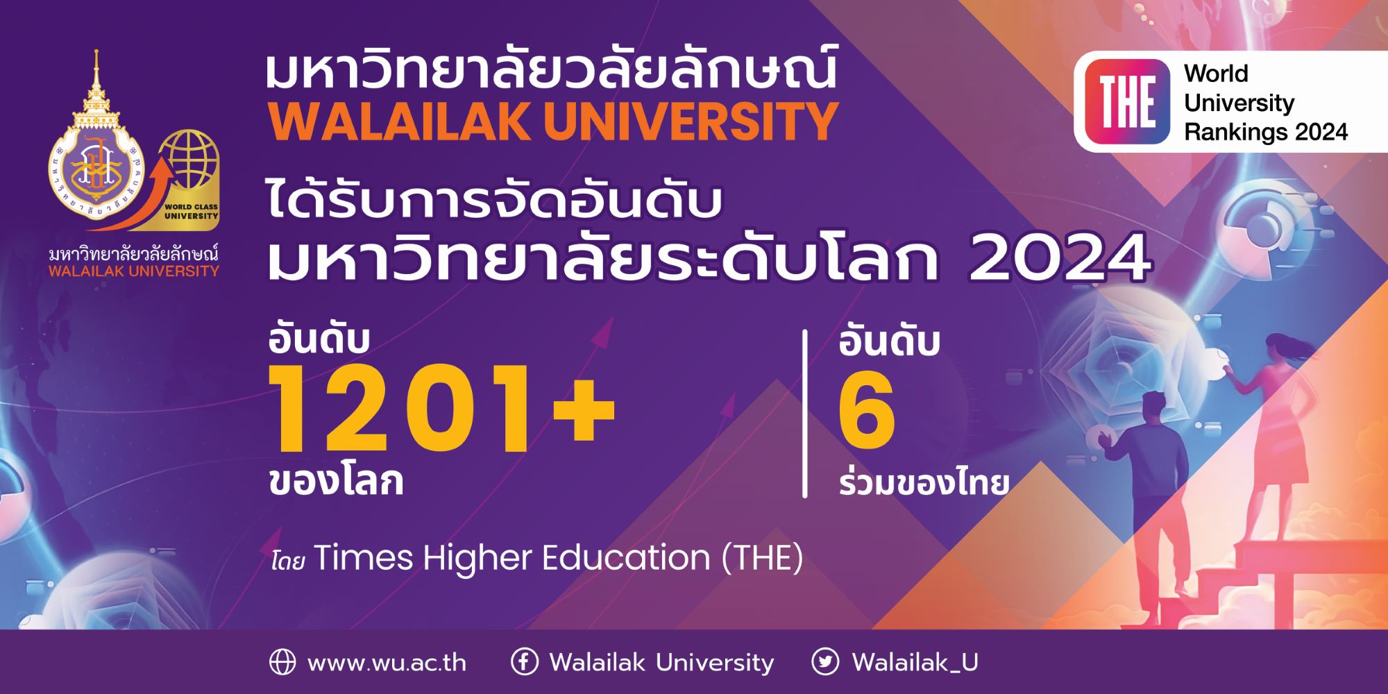 มหาวิทยาลัยวลัยลักษณ์ ได้รับการจัดอันดับจาก Times Higher Education(THE) ได้ประกาศผลการจัดอันดับมหาวิทยาลัยโลก World University Rankings 2024 ผลปรากฏว่า มหาวิทยาลัยวลัยลักษณ์ได้รับการจัดอันดับโลกขยับขึ้นมาอยู่ในอันดับที่ 1201-1500 ของโลก จากมหาวิทยาลัยที่เข้ารับการจัดอันดับโลกทั้งหมด 1,904 แห่งทั่วโลก และเป็นอันดับที่ 6 ร่วมของประเทศไทย จากมหาวิทยาลัย 19 แห่งที่ผ่านเงื่อนไขและได้รับการจัดอันดับในปีนี้