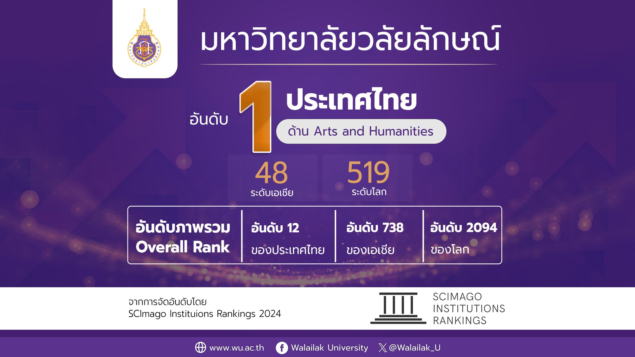 เมื่อเร็วๆ นี้ SCImago Institutions Rankings (SIR) ได้ประกาศผลการจัดอันดับองค์กรด้านการวิจัยระดับโลก ประจำปี 2024 ผ่าน ว็บไซต์ https://www.scimagoir.com ผลปรากฏว่า มหาวิทยาลัยวลัยลักษณ์ สามารถคว้าอันดับ 1 ของประเทศ การจัดอันดับประเภทสาขาวิชาในสาขา Arts and Humanities เป็นอันดับที่ 48 ของเอเชีย อันดับ 519 ของโลก จากมหาวิทยาลัยจำนวน 33 แห่งในไทย 1,671 แห่งในเอเชียและ 4,762 แห่งทั่วโลกที่ได้รับการจัดอันดับ