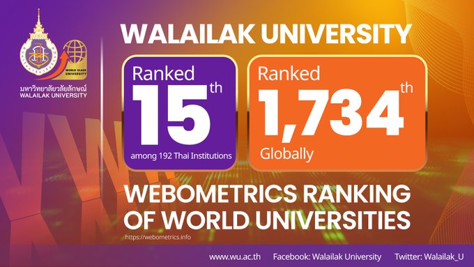 มหาวิทยาลัยวลัยลักษณ์ ขึ้นอันดับที่ 14 ของไทย จาก 192 มหาวิทยาลัยทั่วประเทศ อันดับ 1,622 ของโลก จากการจัดอันดับ Webometrics Ranking of World Universities 2024 รอบเดือนมกราคมนี้