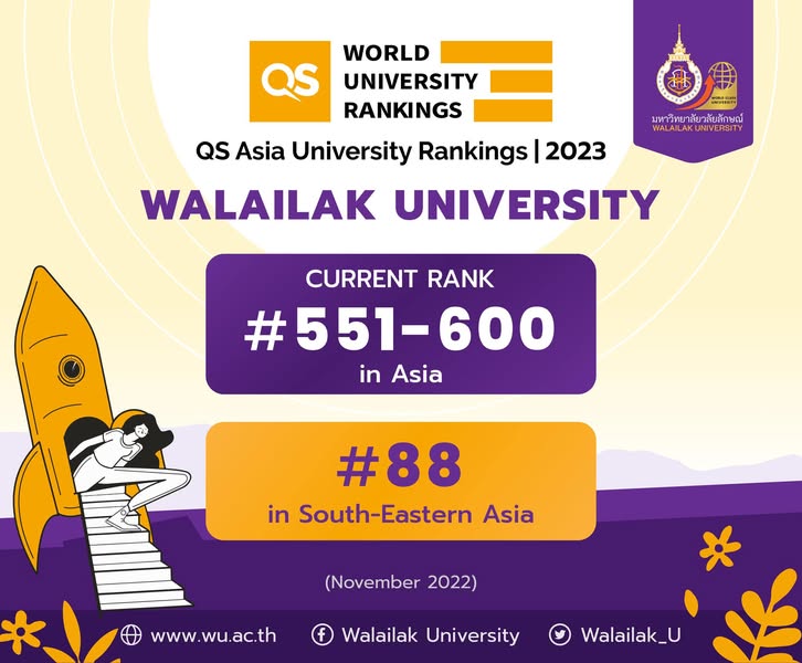 ผลการจัดอันดับมหาวิทยาลัยชั้นนำของโลกโดย QS Asia University Rankings 2023 มหาวิทยาลัยวลัยลักษณ์ได้รับการจัดอันดับที่ 551-600 ของเอเชีย และอันดับที่ 88 ของเอเชียตะวันออกเฉียงใต้