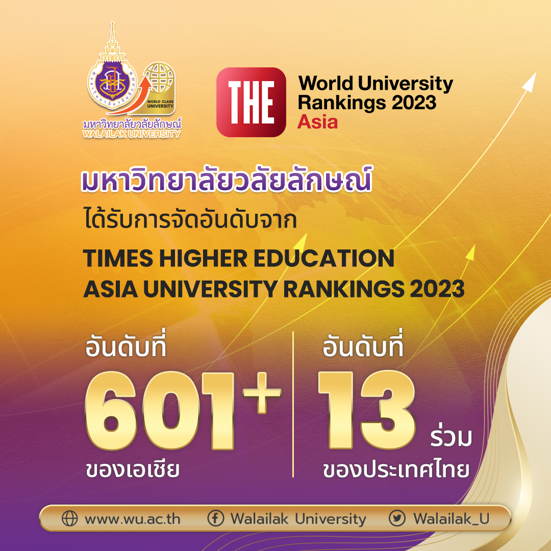 Times Higher Education (THE) ได้ประกาศผลการจัดอันดับมหาวิทยาลัยระดับเอเชีย THE Asia University Rankings 2023 ผ่านเว็บไซต์ https://www.timeshighereducation.com ผลปรากฏว่า มหาวิทยาลัยวลัยลักษณ์ ได้รับการจัดอันดับมหาวิทยาลัยระดับเอเชียแล้ว โดยถูกจัดให้อยู่ในอันดับที่ 601+ จากมหาวิทยาลัยทั้งหมด 669 แห่งทั่วเอเชีย และเป็นอันดับที่ 13 ของประเทศไทย จากมหาวิทยาลัย 18 แห่งที่ผ่านเงื่อนไขและได้รับการจัดอันดับในปีนี้