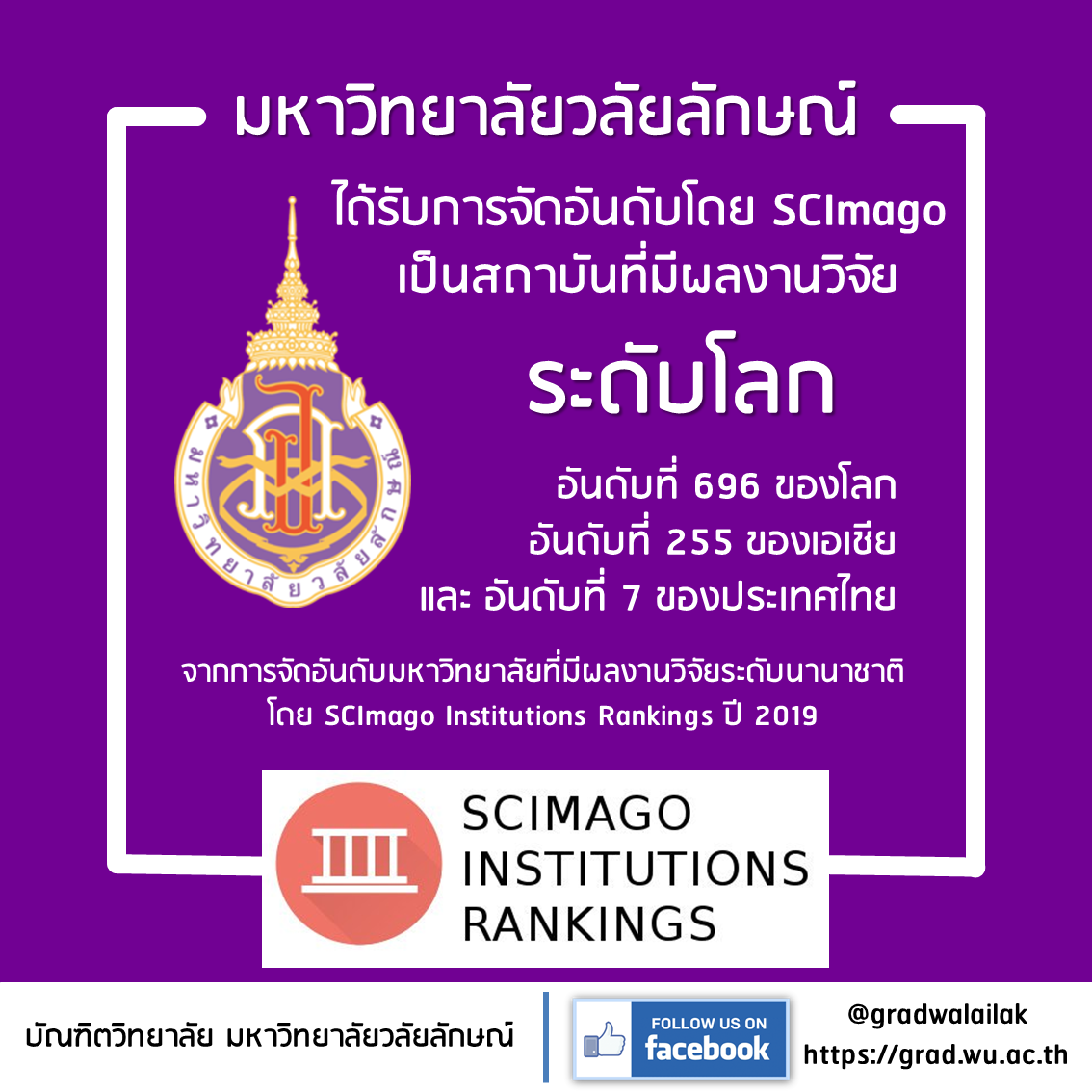 SCImago announced the results of the university’s global innovation rankings in 2019. Walailak University is currently ranked 6th in Thailand, 148th in Asia and 429 in the world. Congratulations!