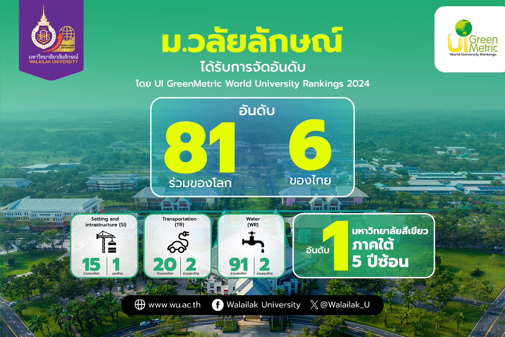 มหาวิทยาลัยวลัยลักษณ์ ภูมิใจได้รับการจัดอันดับมหาวิทยาลัยสีเขียวโลกดีขึ้นต่อเนื่อง อยู่ในอันดับ 81 ร่วมของโลก อันดับ 6 ของไทย พร้อมครองแชมป์มหาวิทยาลัยสีเขียวภาคใต้ 5 ปีซ้อน จัดโดย UI GreenMetric World University Rankings 2024