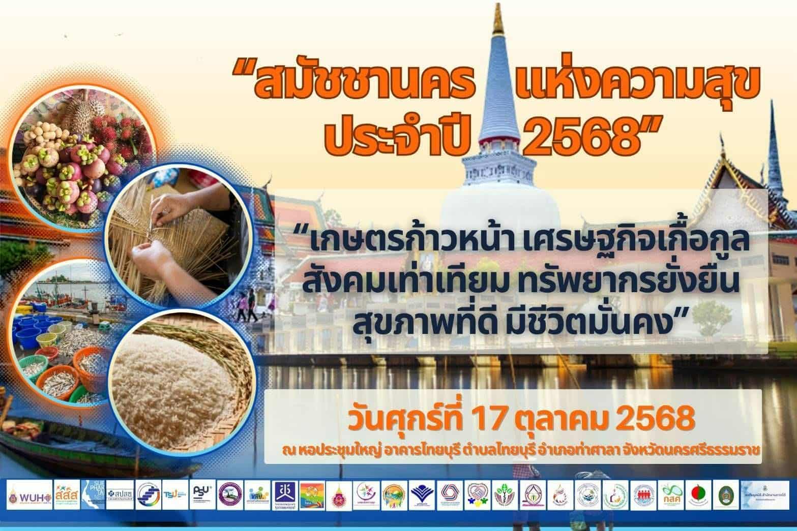 พรุ่งนี้ (๑๗ ต.ค.๖๘) แล้วครับสำหรับงาน สมัชชานครแห่งความสุข ประจำปี 68 “หลากลางของคนคอน” จะเป็นที่ “รวมคน สร้างคอน” อีกครั้ง หมุดหมายสำคัญคือการร่วมกันขับเคลื่อนนครศรีฯ ให้ดีกว่าเดิม ใน ๖ มิติ คือ “เกษตรก้าวหน้า เศรษฐกิจเกื้อกูล สังคมเท่าเทียม ทรัพยากรยั่งยืน สุขภาพที่ดี มีชีวิตมั่นคง” ภายในงานทุกท่านจะได้สัมผัสบรรยากาศดังนี้ครับ
