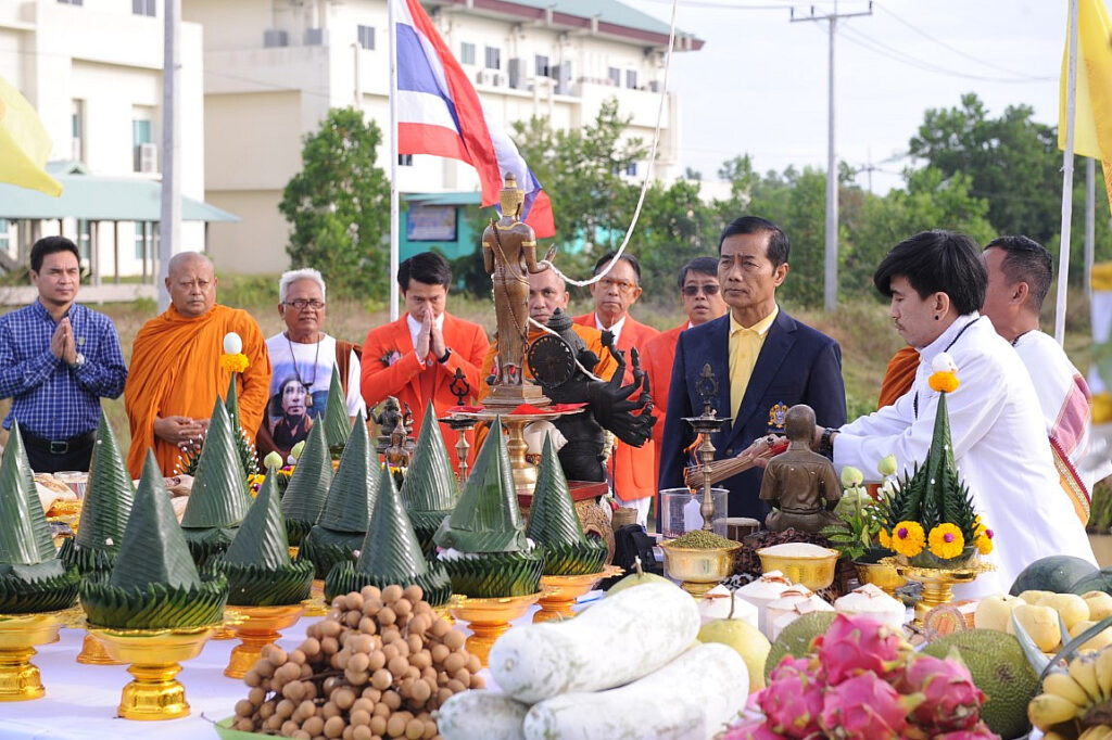 โดยพิธีเริ่มจากพิธีพราหมณ์ในช่วงเช้า พิธีถวายผ้าป่ามหากุศล และพระสงฆ์เจริญชัยมงคลคาถาวางศิลาฤกษ์ ตามลำดับ หลังสิ้นสุดพิธีกรรมต่าง ๆ ในเวลา 11.00 น. โดยประมาณ ได้นิมนต์พระสงฆ์ฉันภัตตาหาร ณ โรงทานที่ผู้มีจิตศรัทธาได้จัดเตรียมไว้จำนวนกว่า 100 โรงทาน ภายในอาคารของโรงพยาบาลศูนย์การแพทย์ (โรงพยาบาลศูนย์การแพทย์มหาวิทยาลัยวลัยลักษณ์, 2563)