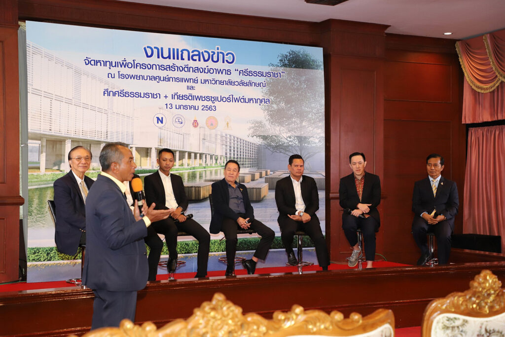 ทั้งนี้ได้มีการจัดงานแถลงข่าวจัดหาทุนเพื่อโครงการสร้างตึกสงฆ์อาพาธ “ศรีธรรมราชา” ณ โรงพยาบาลศูนย์การแพทย์ มหาวิทยาลัยวลัยลักษณ์ และ “ศึกศรีธรรมราชา + เกียรติเพชรซูปเปอร์ไฟต์มหากุศล” จัดขึ้นในวันที่ 13 มกราคม 2563 ณ ห้องชมัยมรุเชฐ สโมสรทหารบก ถนนวิภาวดี–รังสิต โดยได้เรียนเชิญ นายถาวร เสนเนียม รัฐมนตรีช่วยว่าการกระทรวงคมนาคม นายฉาย บุนนาค ประธานกรรมการบริหาร บริษัท เนชั่น มัลติมีเดีย กรุ๊ป จำกัด (มหาชน) ประธานจัดหาทุน นายฉัตรชัย ภู่โคกหวาย กรรมการผู้จัดการ บริษัท เนชั่น บรอดแคสติ้ง คอร์ปอเรชั่น จำกัด (มหาชน) เนชั่นทีวี 22 นายพีรพงศ์ ธีระเดชพงศ์ (เฮียชุ้น เจ้าของศึกมวยเกียรติเพชร) นายพรัญชัย อดิเทพวรพันธ์ (โกเด๊ะ เจ้าของค่ายมวยพรัญชัย) นายสมชาย เทศรุ่งเรือง หัวหน้าคณะค่ายพี.เค.แสนชัย มวยไทยยิม และศาสตราจารย์ ดร. สมบัติ ธำรงธัญวงศ์ อธิการบดีมหาวิทยาลัยวลัยลักษณ์ ร่วมพูดคุยและให้ข้อมูลกับสื่อมวลชน