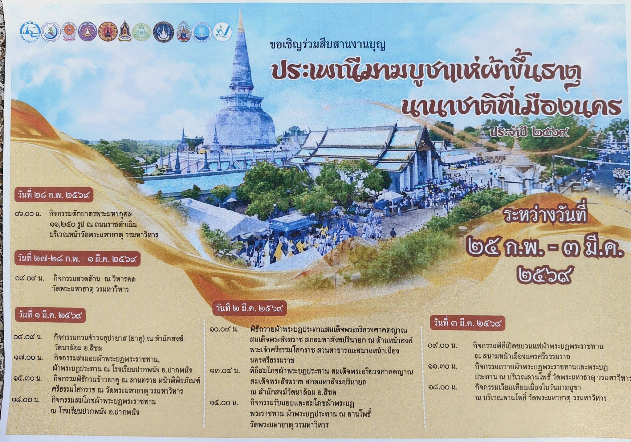 - วันที่ ๓ มีนาคม ๒๕๖๙ ณ วัดพระมหาธาตุ วรมหาวิหาร จังหวัดนครศรีธรรมราช