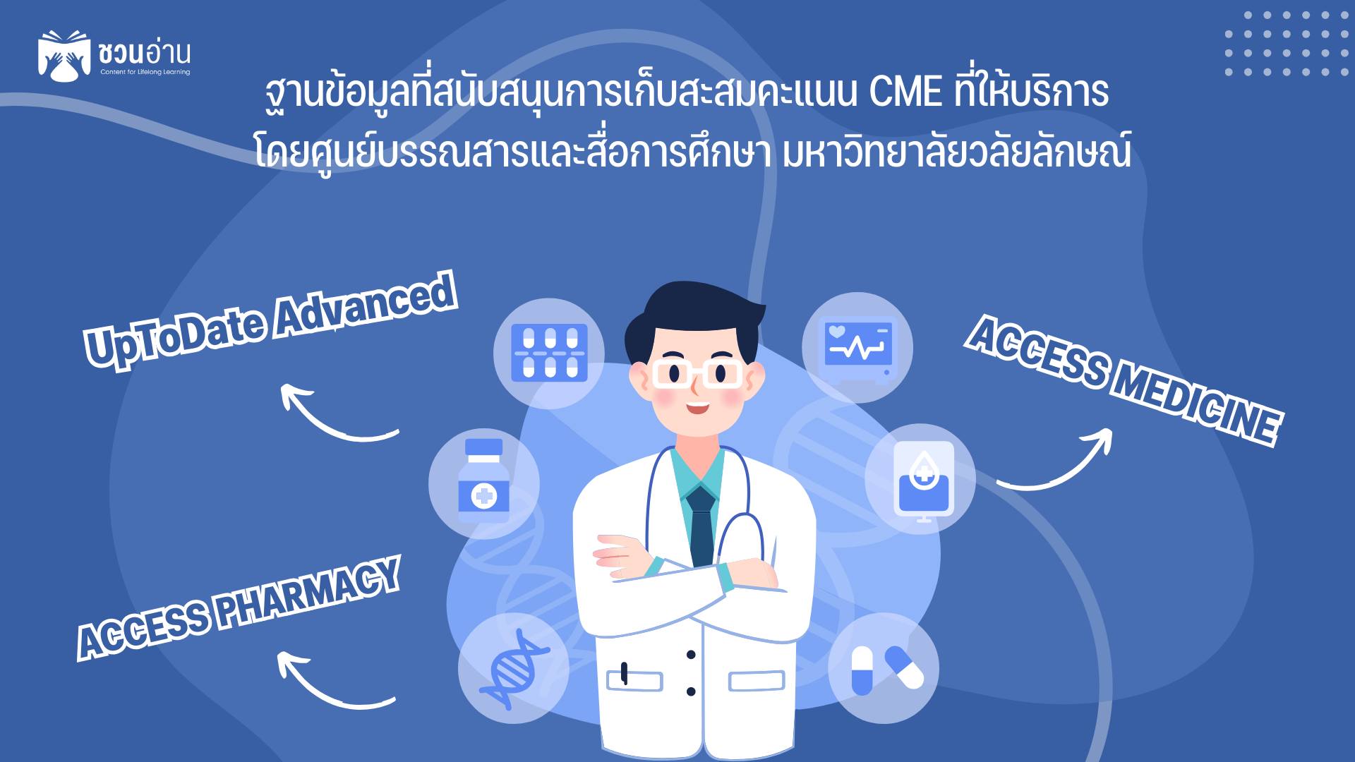 และสำหรับการแนะนำการใช้งานสำหรับแพทย์ที่ต้องการสะสมคะแนน CME จากฐานข้อมูลทั้ง 3 ฐาน คือ UpTodate Advances, Access Medicine และ Access Pharmacy ท่านที่สนใจ คลิก เพื่ออ่านเพิ่มเติมได้เลย
