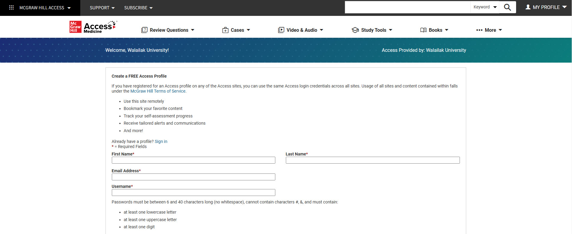 1. ไปยังเว็บไซต์ของฐานข้อมูล คือ https://accessmedicine.mhmedical.com/หรือ https://accesspharmacy.mhmedical.com/