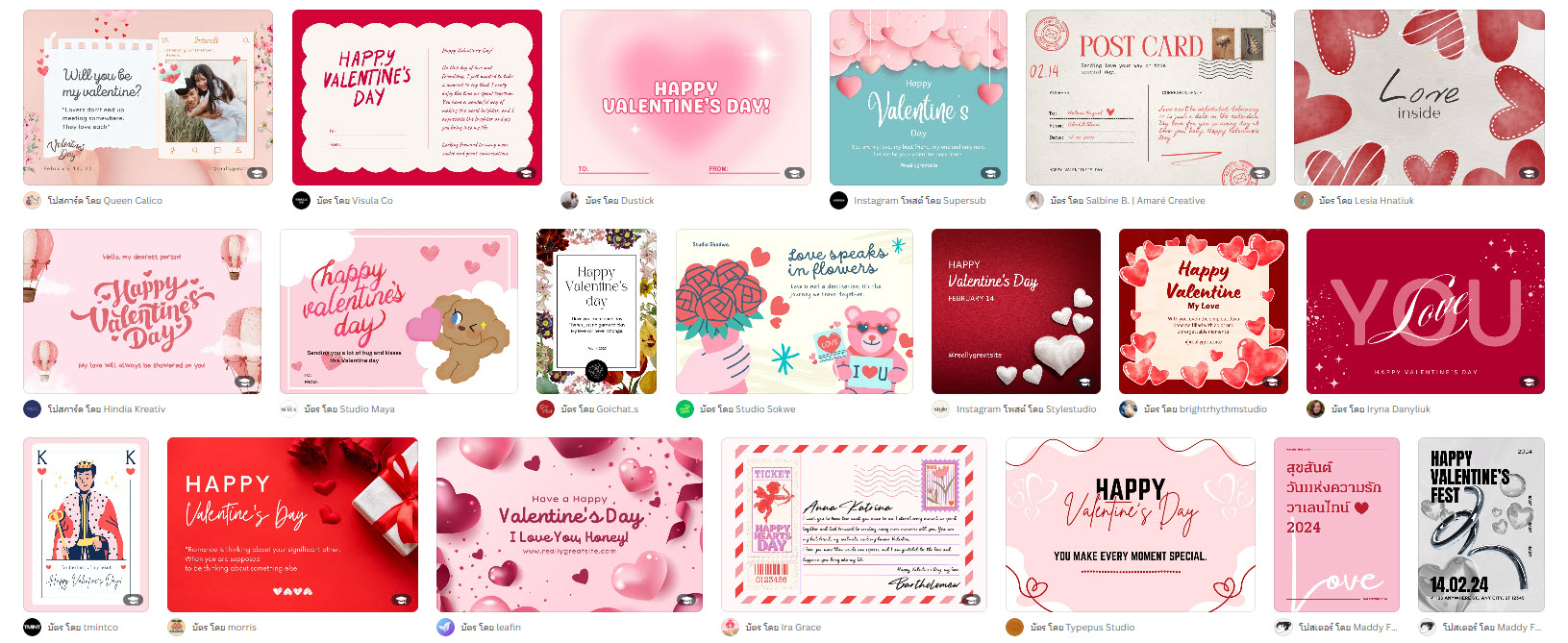 เลือกใช้และปรับไปใช้ได้เลย หรือหากคุณไม่ถูกใจกับการ์ดสำเร็จรูปที่เราทำให้ สามารถออกแบบและทำได้ด้วยตัวเองง่าย ๆ ด้วย canva ที่มีการ์ดหลากหลายให้นำมาใช้และสามารถปรับแต่งได้ตามความต้องการ เพราะ canva ได้บอกว่า “เราได้รวบรวมเทมเพลตแบบการ์ดวันวาเลนไทน์ หลากหลายแบบ หลายสไตล์ เหมาะสำหรับมอบให้คนที่คุณรัก ไม่ว่าจะเป็นสไตล์โรแมนติก หรือหวานแหวว คุณสามารถสร้างและใช้งานตัวอย่างการ์ดวันวาเลนไทน์ออนไลน์ได้ง่าย ๆ ทุกที่ ทุกเวลา ตอบโจทย์ทุกความต้องการที่เรา” (CANVA) เพียงสมัครสมาชิก CANVA จะแบบใช้งานฟรีหรือจ่ายเงินก็ได้ เราสามารถออกแบบและส่งการ์ดได้ฟรี ที่นี่