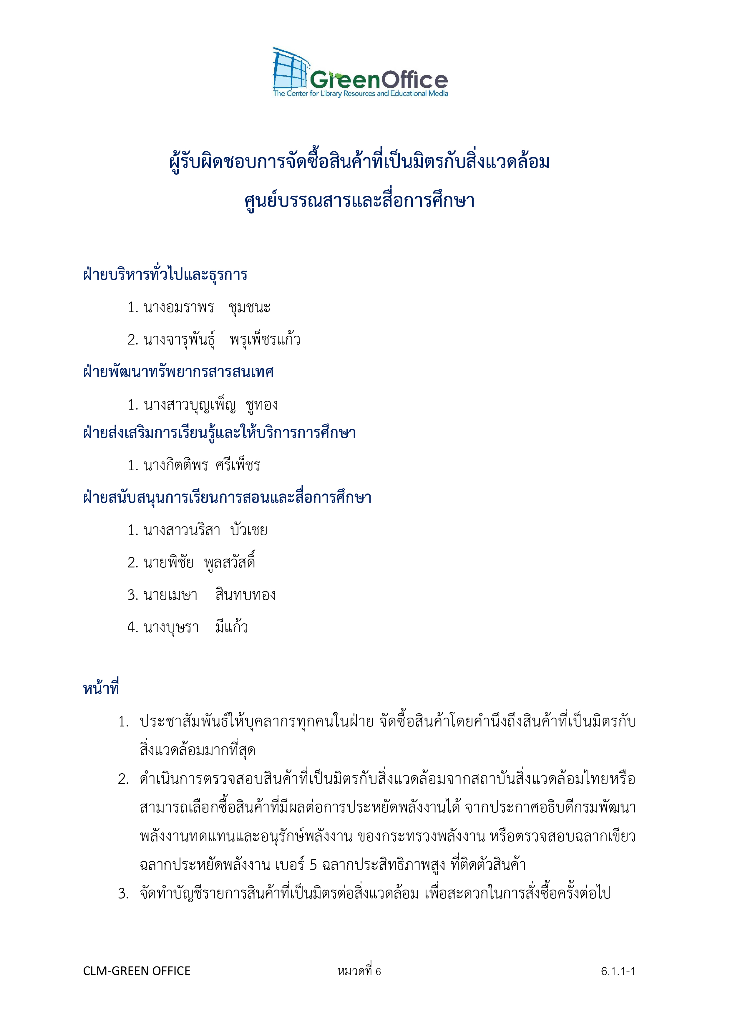 มีการกำหนดผู้รับผิดชอบในการจัดซื้อสินค้าอย่างชัดเจน เป็นพนักงานที่มีความเข้าในเรื่องการจัดซื้อสินค้าเป็นอย่างดี เนื่องด้วยเป็นผู้ที่ปฏิบัติงานจัดซื้อทรัพยากรหรืออุปกรณ์ต่าง ๆ อยู่แล้ว และเมื่อมีการจัดซื้อจะมีการตรวจสอบรายการที่เป็นมิตรกับสิ่งแวดล้อมก่อนทุกครั้ง ดังรายชื่อ