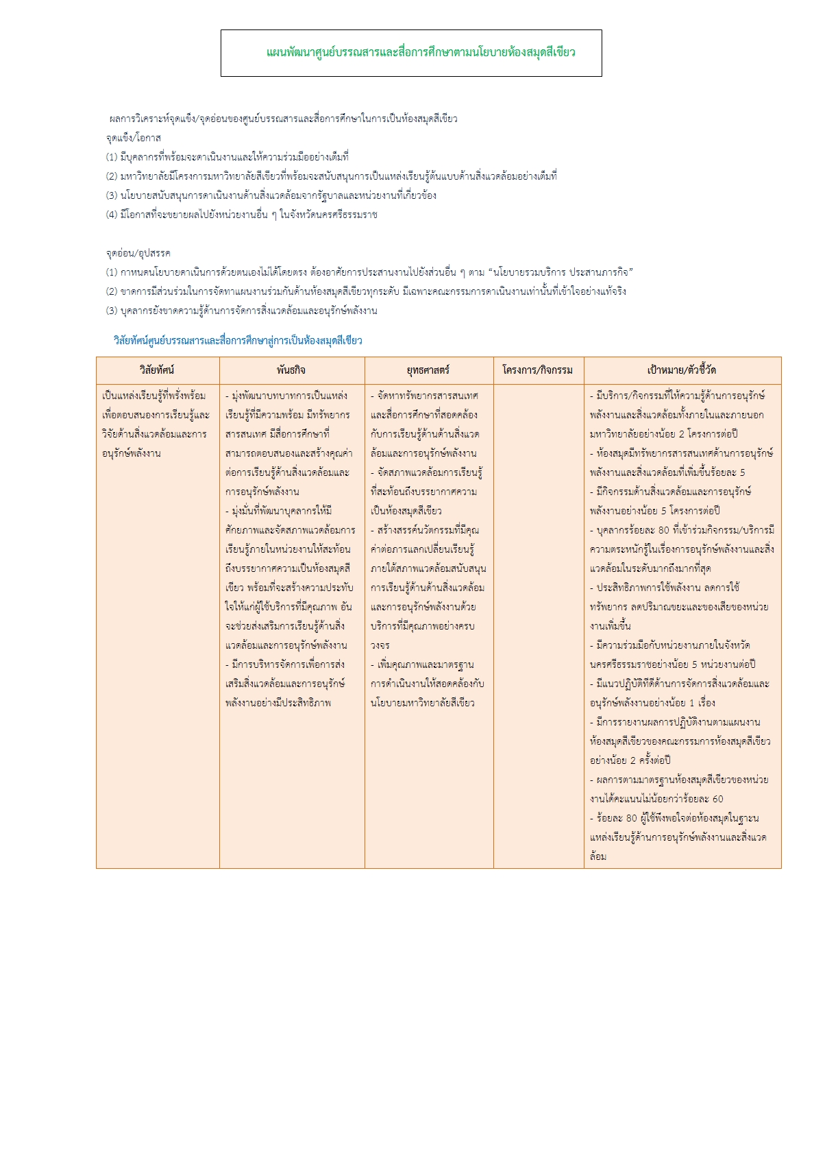 2. มีการวิเคราะห์ประเด็นปัญหาด้านพลังงานและสิ่งแวดล้อม เพื่อเป็นข้อมูลในการกำหนดเป้าหมาย ยุทธศาสตร์ และนำไปสู่การกำหนดแนวทางการดำเนิน งานที่สอดคล้องกับวิสัยทัศน์ พันธกิจ การเป็นห้องสมุดสีเขียว