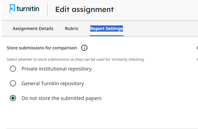 หากไม่เปลี่ยนการตั้งค่า Store submissions for comparison ไม่เก็บต้นฉบับ การส่งงานเข้าตรวจใน Assignment นั้น ๆ ก็ยังคงเก็บเป็นต้นฉบับเช่นเดิม และหากไม่ส่งคำขอลบต้นฉบับที่เก็บในคลังไปแล้ว Self Plagiarism ก็ยังคงอยู่เช่นกัน เพราะฉะนั้น Instructor เจ้าของ Class ต้องดำเนินการทั้ง 2 กระบวนการ และตรวจสอบการตั้งค่า Assignment ให้ครบถ้วนทั้งสามส่วน คือ 1.Assignment Details 2.Rubirc 3.Report Settings