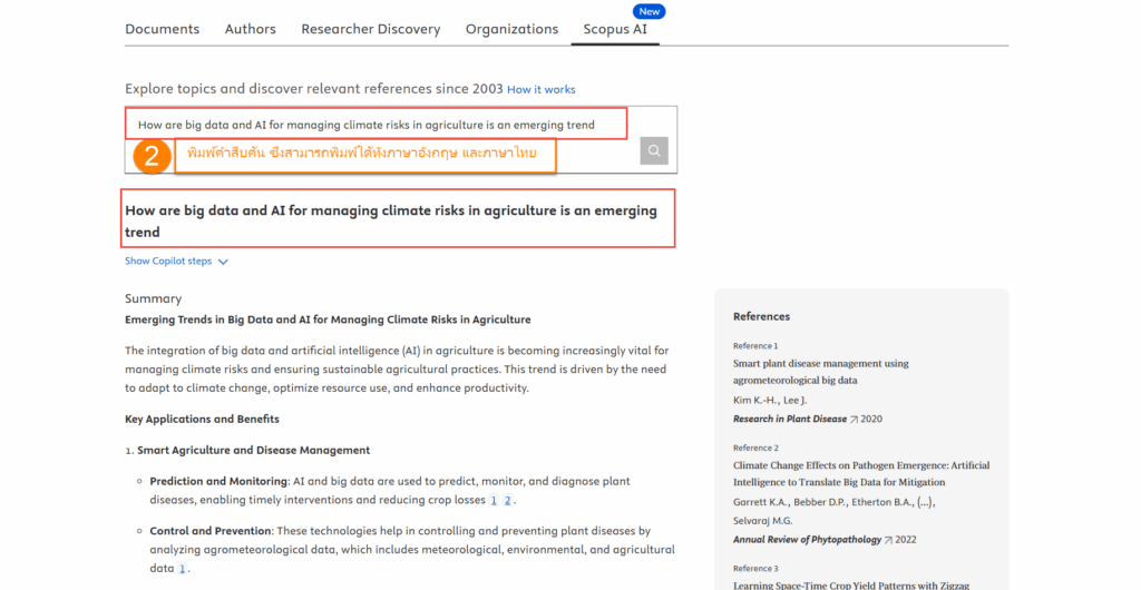 - พิมพ์ประโยคข้อความที่ต้องการสืบค้น ซึ่งสามารถใช้ได้ทั้งภาษาอังกฤษ และ ภาษาไทย เช่น How are big data and AI for managing climate risks in agriculture is an emerging trend หรือ อะไรเป็นกลไกสำคัญที่ช่วยให้ผลผลิตทางการเกษตรแม่นยำมากขึ้น