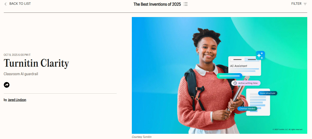 Turnitin Clarity ได้รับรางวัล TIME’s Best Inventions of 2025 หนึ่งในสิ่งประดิษฐ์ยอดเยี่ยมประจำปี 2025 ของ TIME ด้วยแนวทางสร้างสรรค์ที่มีความโปร่งใสและการใช้ AI อย่างมีความรับผิดชอบและมีความน่าเชื่อถือ Turnitin Instructor’s Tips นำส่วนที่มีการเปลี่ยนแปลงใน version ของ Turnitin Clarity มาแนะนำกันค่ะ