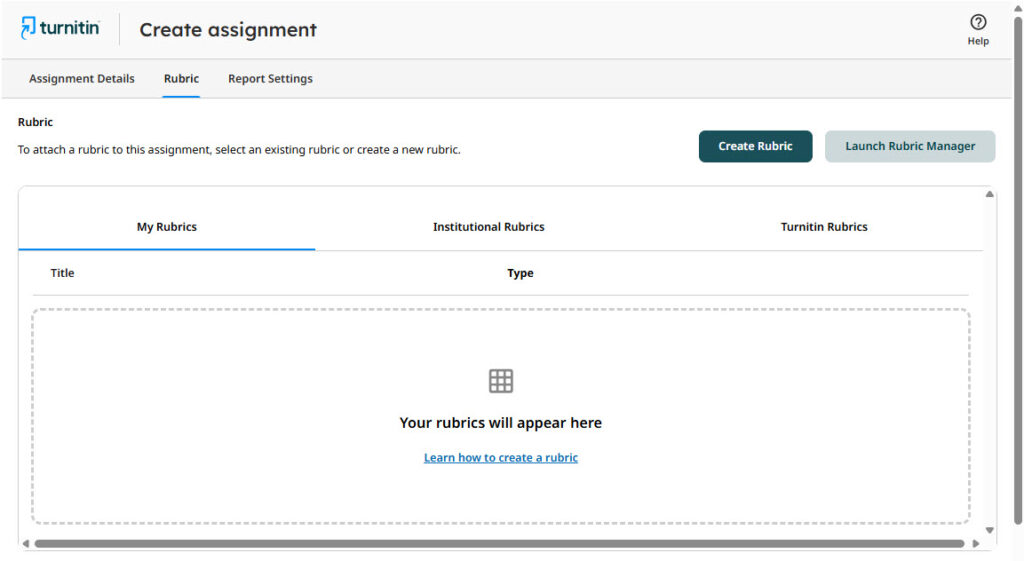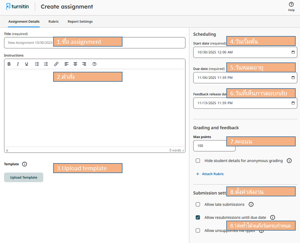3. เข้าสู่หน้า Create assignment ประกอบด้วย Assignment Details, Rubric และ Report Setting ซึ่งต้องตั้งค่าให้ครบทั้งหมด