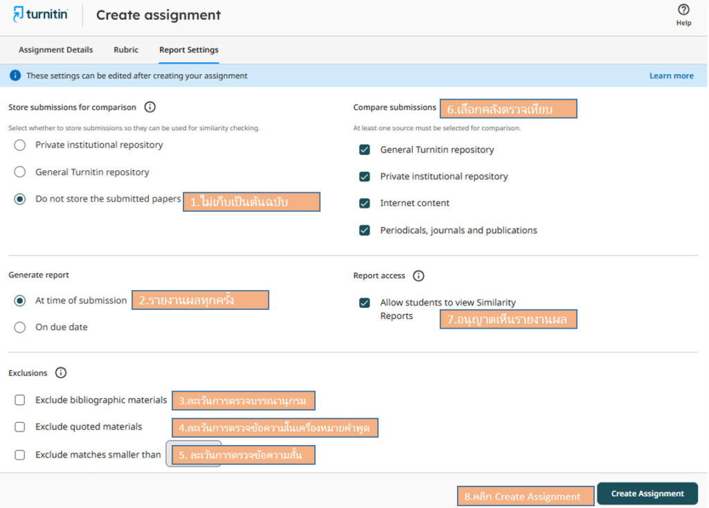7. Allow students to view Similarity Reports อนุญาตให้เจ้าของผลงานเห็นรายงานผลการตรวจ (ถ้าไม่อนุญาต student จะไม่เห็นตัวเลขความซ้ำและไม่สามารถเข้าถึงรายงานผลการตรวจ)