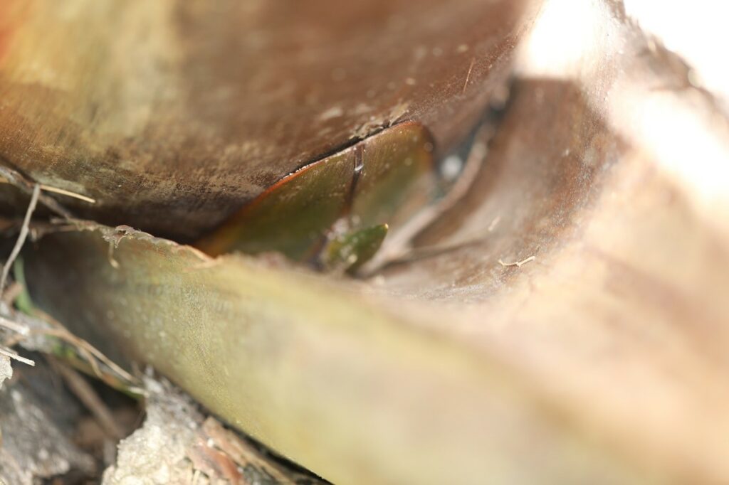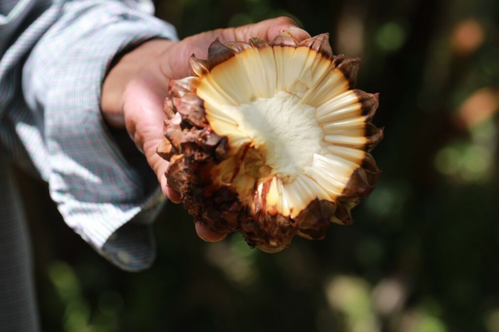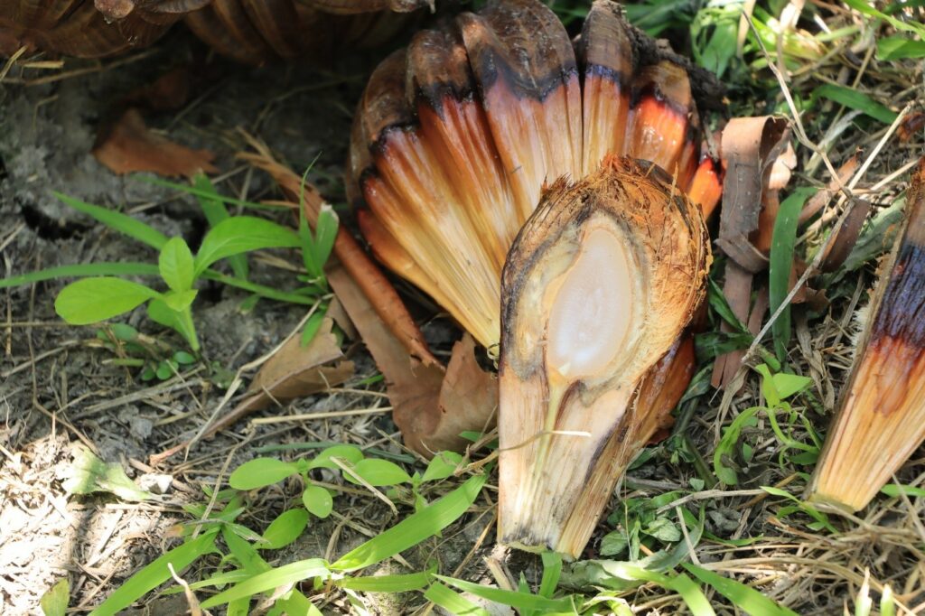 7. ลูกหัวเสี้ยน สีผิวของลูกจาก มีลักษณะเป็นสีน้ำตาลเข้ม เนื้อข้างในจะเริ่มแข็งและมีเส้นใย