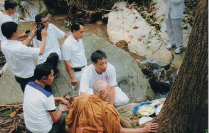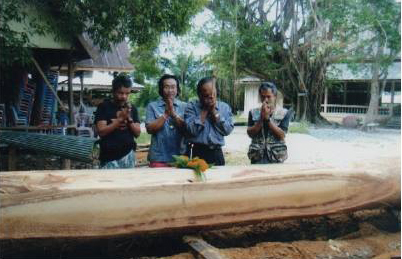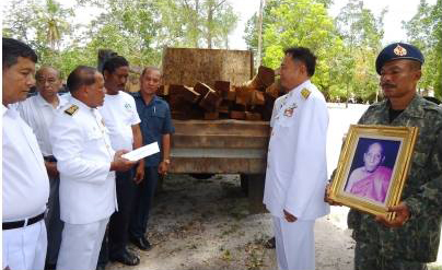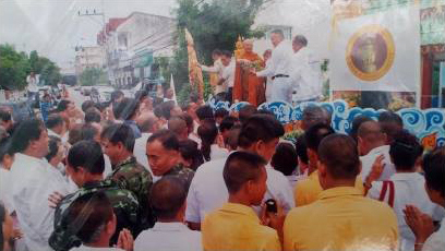 ภาพการเชิญไม้ตะเคียนบนน้ำตกผาเมือง จากหนังสือหลักเมืองขนอม (แม่สนตราเทวี)