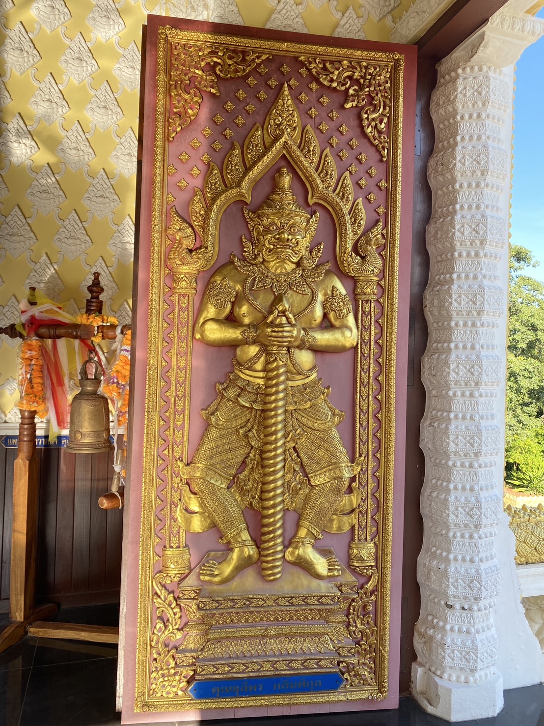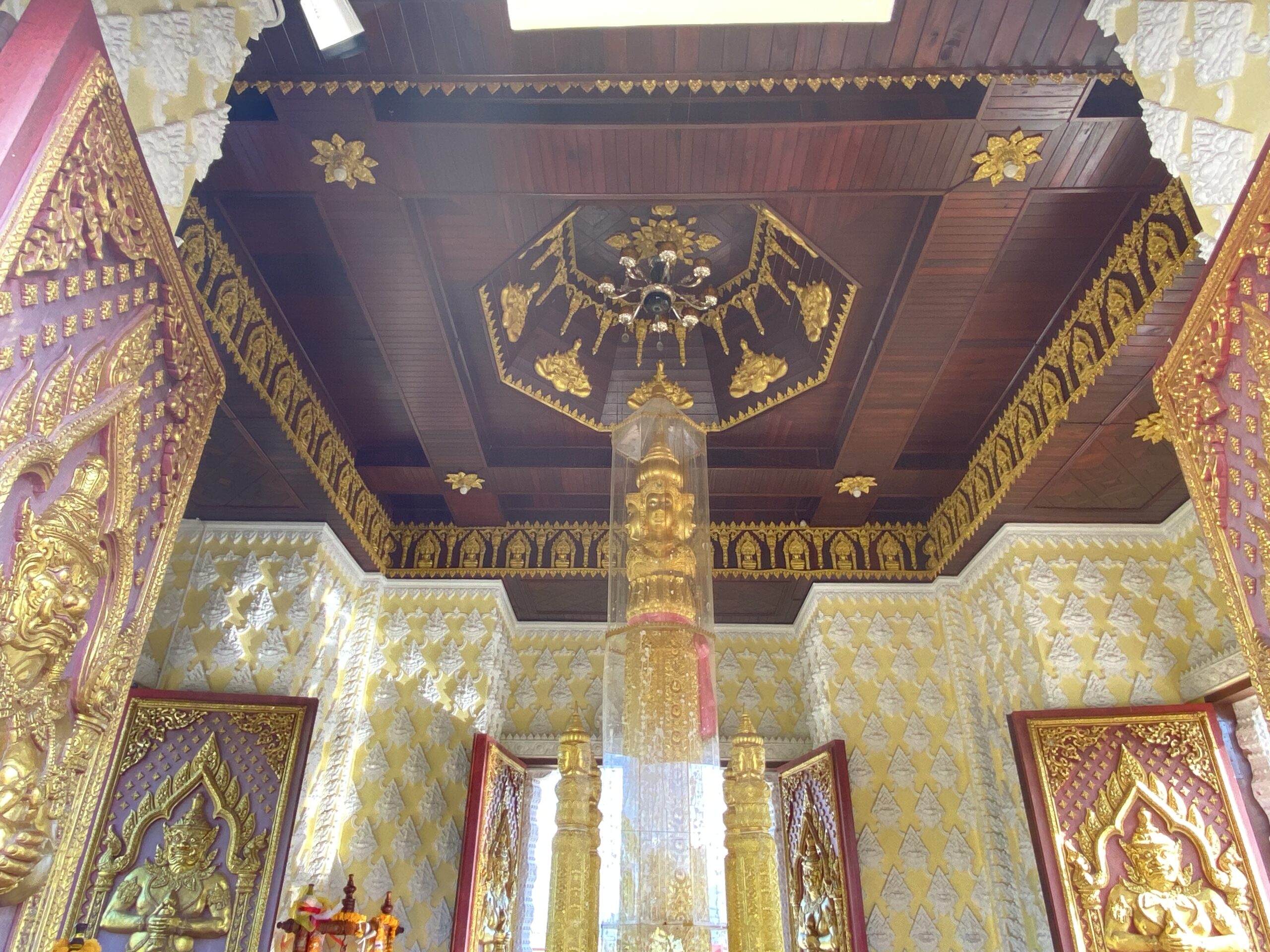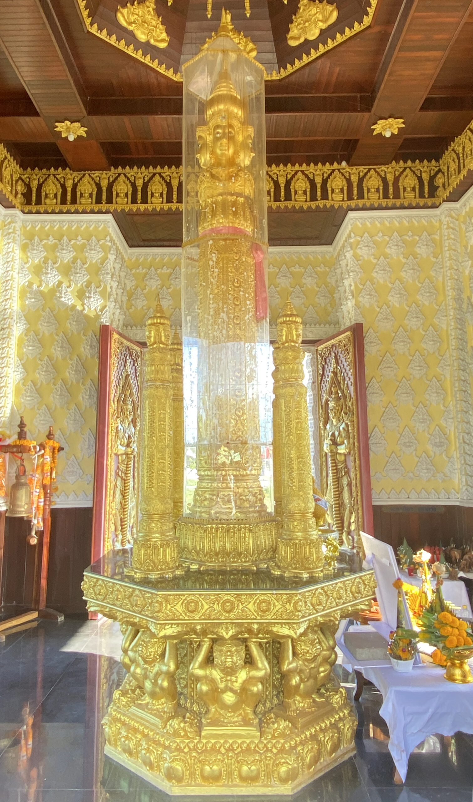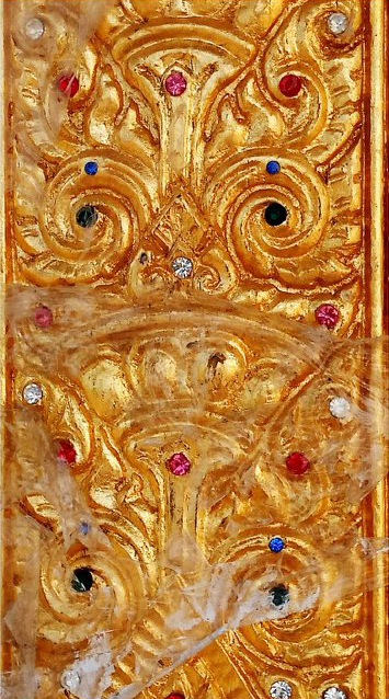 2. ลวดลายประดับเสาทั้งแปดแถว เป็นลวดลายขดมงคล และลวดลายดอกจันทน์ แสดงถึงการกําเนิดที่เป็นสิริมงคลและมีความประเสริฐ บ่งบอกฐานะของ พระแม่เมืองตระนอมว่าเป็นผู้ที่มีชาติกําเนิดในชั้นชนปกครอง