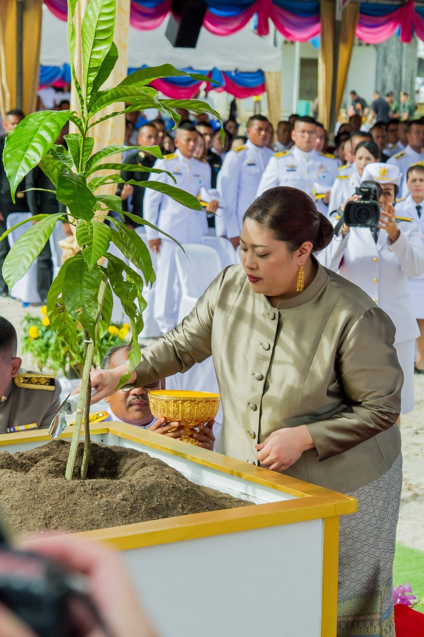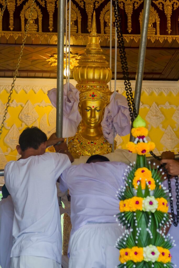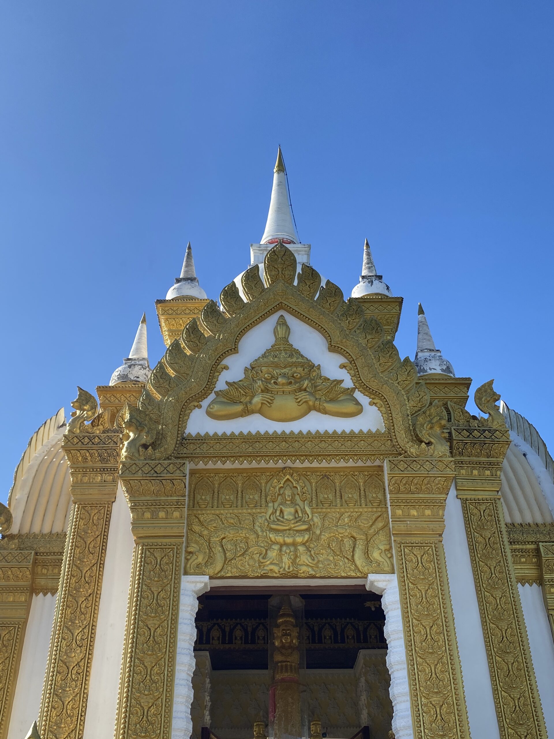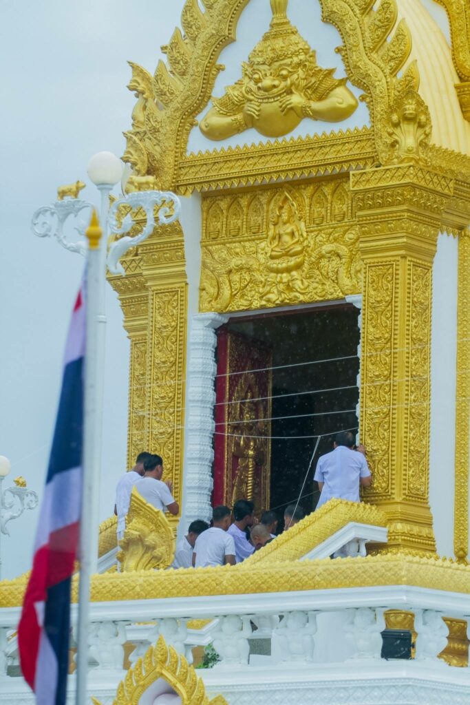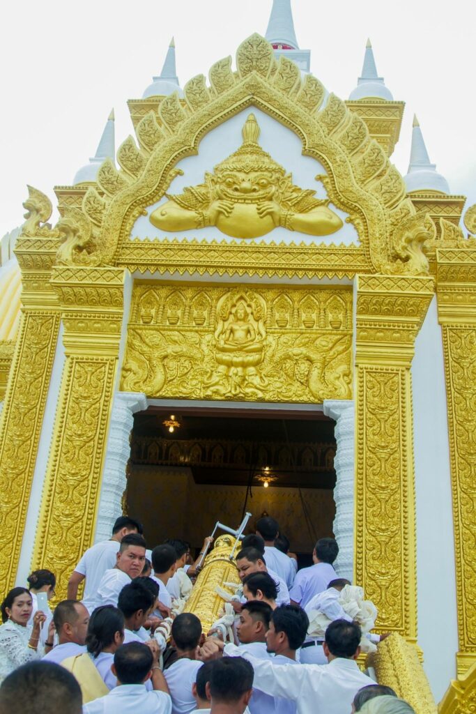 2. ลวดลายประดับเสาทั้งแปดแถว เป็นลวดลายขดมงคล และลวดลายดอกจันทน์ แสดงถึงการกําเนิดที่เป็นสิริมงคลและมีความประเสริฐ บ่งบอกฐานะของ พระแม่เมืองตระนอมว่าเป็นผู้ที่มีชาติกําเนิดในชั้นชนปกครอง