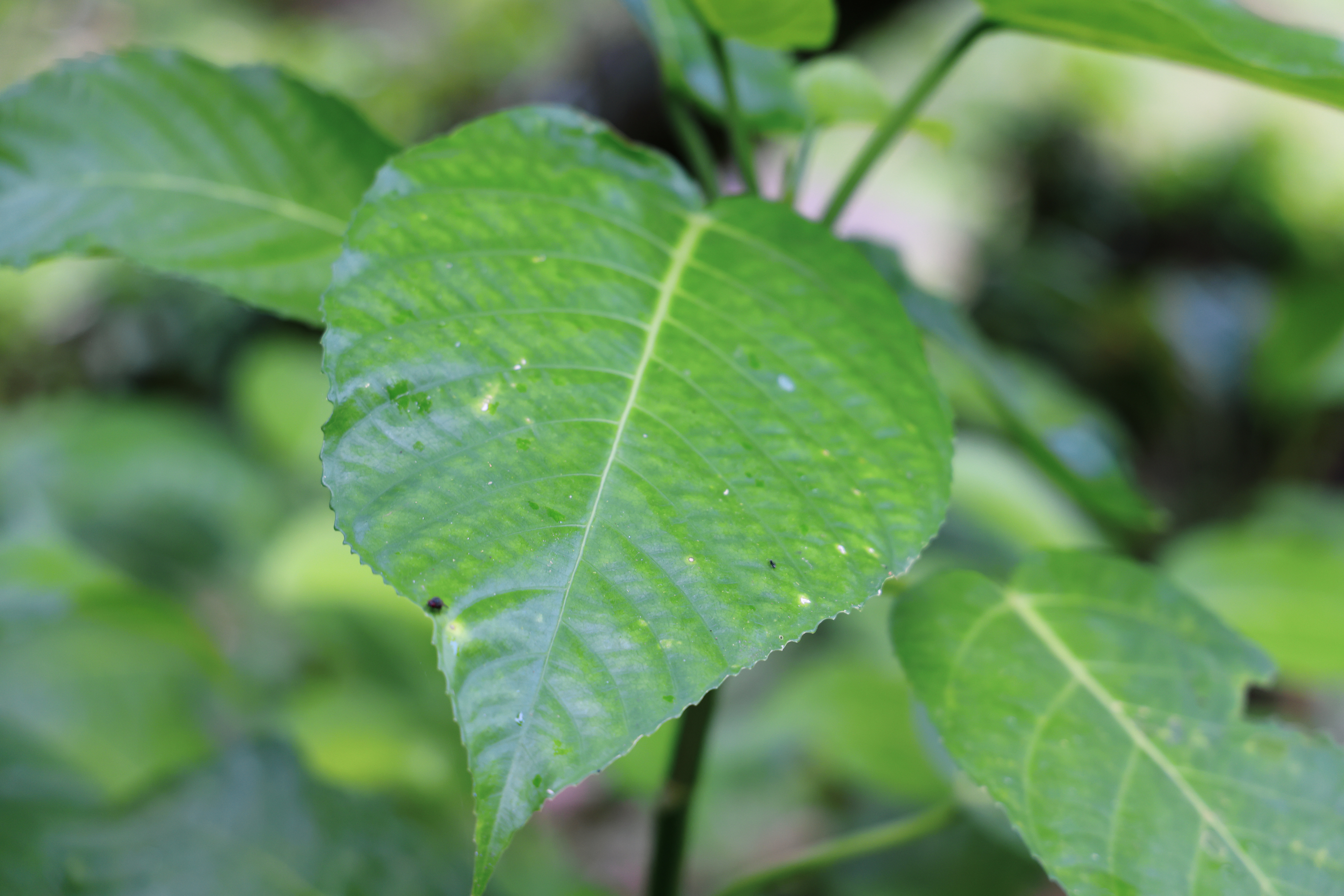 - ลักษณะใบ ใบเป็นใบเดี่ยวออกเรียงตรงข้ามสลับตั้งฉาก ใบเป็นฝ่ามือรูปไข่กว้างหรือรูปไข่เกือบกลม ใบกว้างประมาณ 7-38 เซนติเมตร ยาวประมาณ 4-40 เซนติเมตร ขอบใบหยักเว้าลึกเป็นแฉก 3-7 แฉก ปลายแฉกจะแหลม ฐานใบเป็นรูปหัวใจ ขอบใบเป็นจักคล้ายฟันเลื่อย ผิวใบมีขน หลังใบมีสีเขียวเข้ม ท้องใบมีขนสากระคายมือ มีสีอ่อนกว่า ก้านใบยาวประมาณ 3-15 เซนติเมตร