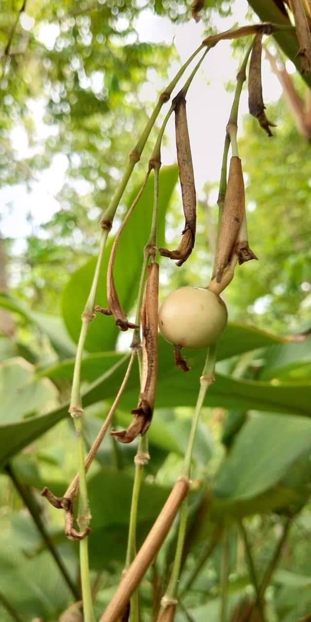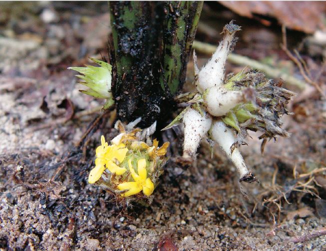 - ดอก สีเหลืองแทงออกจากโคนต้น เป็นช่อเหมือนกล้วยไม้