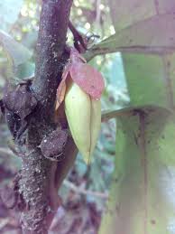 - ใบ กลมปลายแหลม ใบบางเรียบมัน ขอบใบเป็นหยักเล็กน้อย
