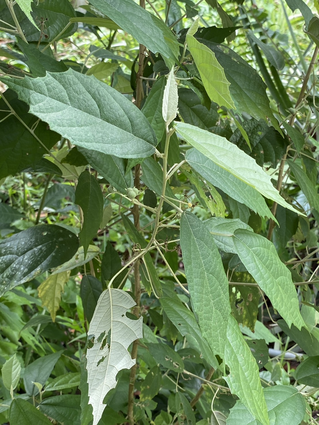 - ใบ เป็นใบเดี่ยว ออกเรียงสลับ รูปไข่หรือรูปวงรี กว้าง 3-8 เซนติเมตร ยาว 6-15 เซนติเมตร ปลายใบแหลม โคนใบสอบมน หรือเป็นทรงกลมแคบ ขอบใบหยักไม่สม่ำเสมอ แผ่นใบหนา ด้านบนเกลี้ยง สีเขียวเข้ม แผ่นใบด้านล่างมีขนสีขาวจำนวนมาก ทำให้มองเห็นแผ่นใบสีขาวหรือสีเงิน ก้านใบยาว 1.5-5 เซนติเมตร มีขน หูใบรูปหอก ขนาดประมาณ 3 มิลลิเมตร ที่ฐานมีต่อม 1 ต่อม เส้นใบข้าง 4-5 คู่