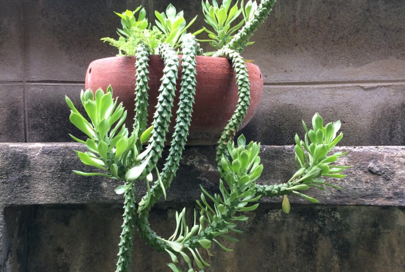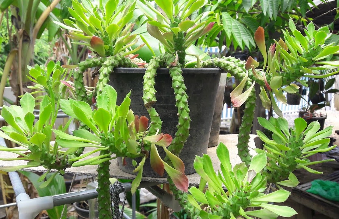 ต้นเถานาคราช เป็นไม้เถาเลื้อย เป็นพืชตระกูลกระบองเพชร มีลักษณะของลำต้นที่ยาวทรงกระบอกฉ่ำน้ำ มีขนาดเส้นผ่าศูนย์กลางประมาณ 2-5-4 เซนติเมตร มีความยาววัดได้ถึง 60 เซนติเมตร มีตารูปขนมเปียกปูนหรือรูปหกเหลี่ยมรอบลำต้น ตรงกลางตาจะมีหนามขนาด 1-2 มิลลิเมตร สีแดง อยู่ 2 อัน
