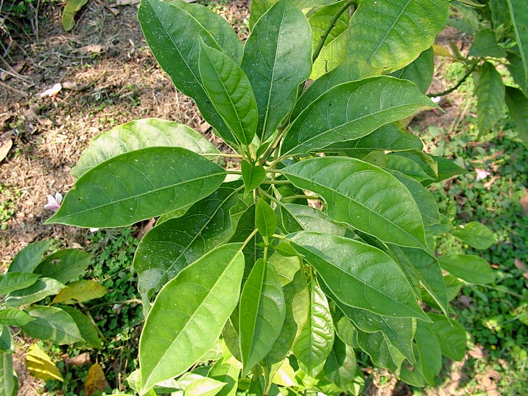 - ใบแผ่เรียบ หนาคล้ายแผ่นหนัง ด้านบนสีเขียวเข้มเป็นมัน ด้านล่างสีเขียวอ่อน เกลี้ยงทั้งสองด้าน หรือมีขนกระจายตามเส้นกลางใบ เส้นใบข้าง 5-7 คู่ เส้นใบย่อยแบบร่างแห ชัดเจนทางด้านล่าง ก้านใบยาว 4-8 มม.