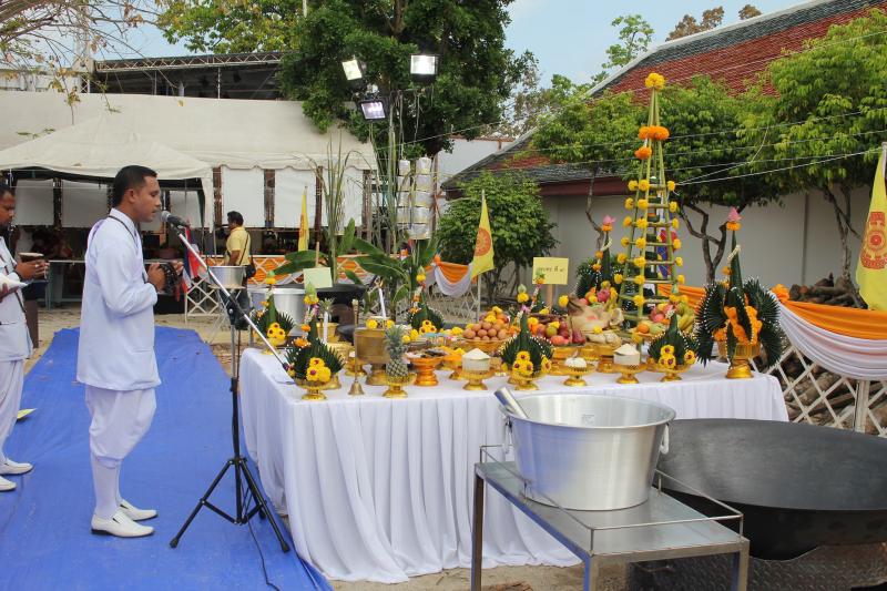 - พิธีกวนข้าวยาโค เริ่มต้นจากสาวพรหมจารียืนประจำกระทะละ ๓ คน พนักงานนำเครื่องปรุงวางบนโต๊ะข้างกระทะ ประธานในพิธีเข้าประจำที่กระทะ เริ่มพิธีกวนข้าวยาคูโดยประธานในพิธีเทเครื่องปรุงลงในกระทะ จับไม้กวนมีการลั่นฆ้องชัย ตั้งแต่เริ่มกวนพระสงฆ์เจริญชัยมงคลคาถาจนจบเป็นอันว่าเสร็จพิธี ต่อไปผู้เข้าร่วมงานจะสามารถร่วมกวนข้าวยาโคได้