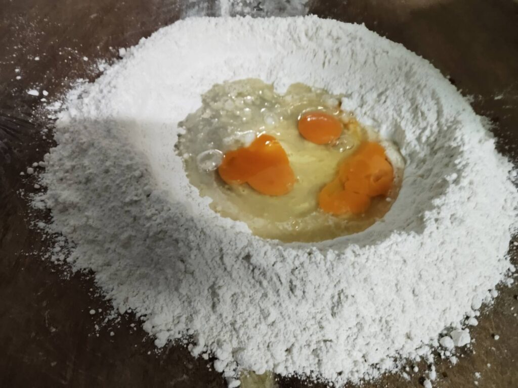 - นำแป้งทำขนมที่เตรียมไว้ กองบนโต๊ะนวดแป้ง โดยกองไว้ให้มีปริมาณที่เยอะพอควร ตามสูตรของร้าน แล้วทำเป็นหลุม พร้อมกับตีไข่ใส่ลงไป จากนั้นใส่น้ำลงไปให้พอดีกัน