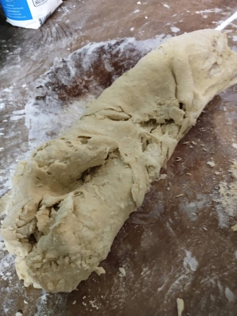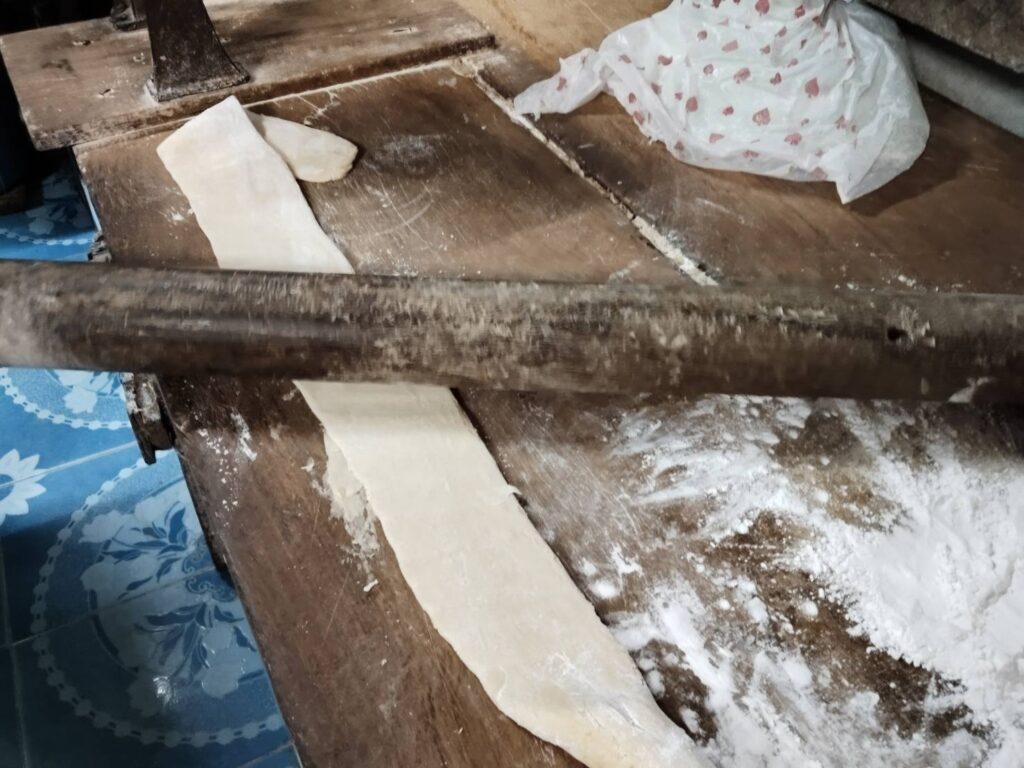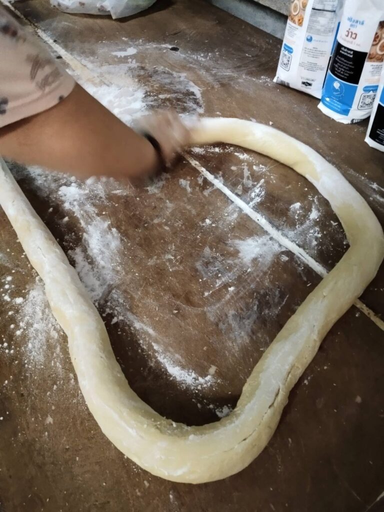 - จากนั้นใช้ไม้ตีแป้งให้ราบแบนเป็นแผ่นยาวจนสุด