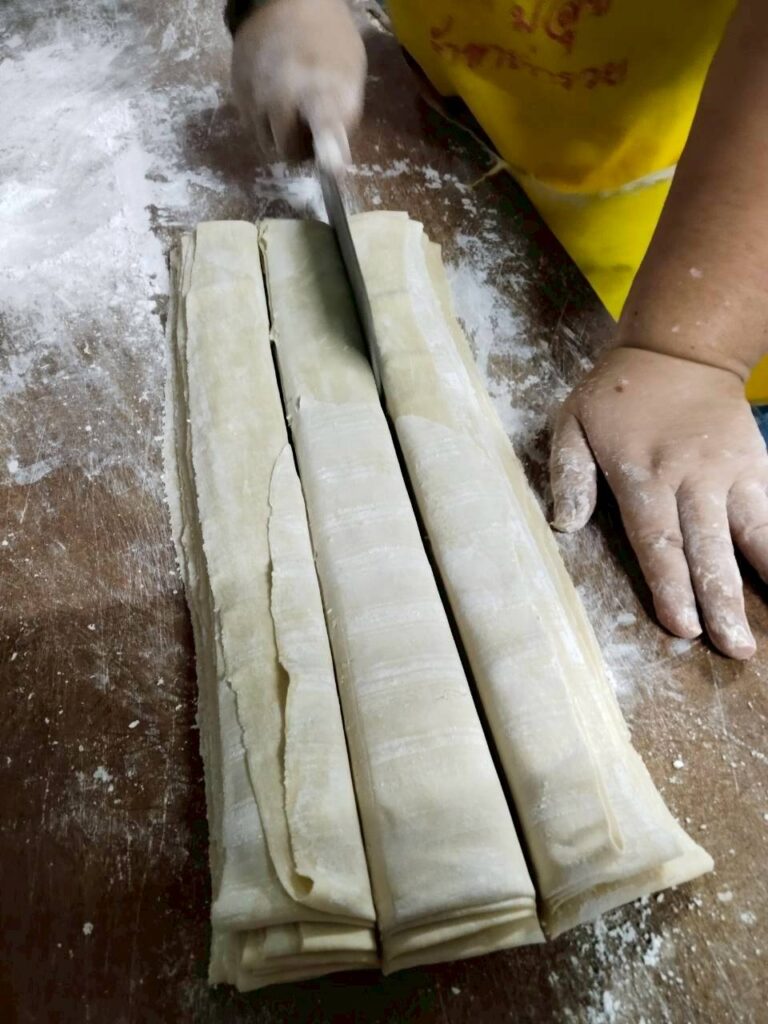 - จากนั้นนำแป้งที่รีดบางเนียนแล้ว มาหั่นด้วยมีดเป็นชิ้น ๆ ยาวพอประมาณ