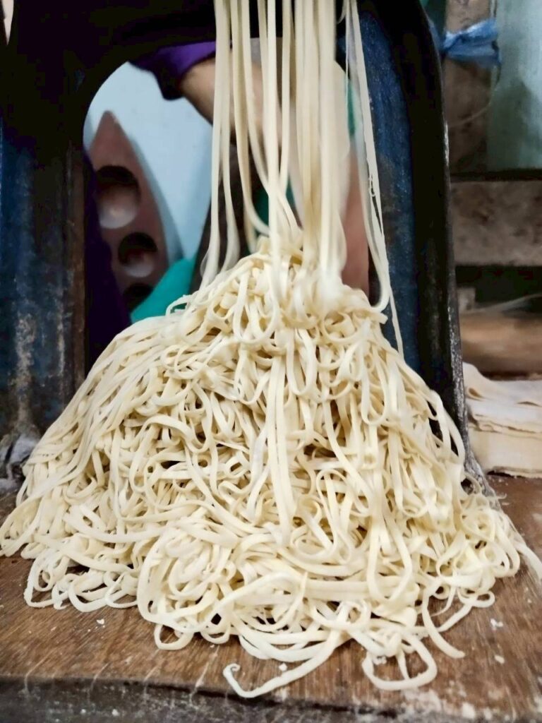 - จากนั้นนำแป้งแต่ละชิ้นมาเข้าเครื่องทำเส้นบะหมี่ โดยผู้ทำจะใช้มือข้างหนึ่งส่งแป้งเข้าไป และมืออีกข้างจะหมุนจักรดังกล่าว