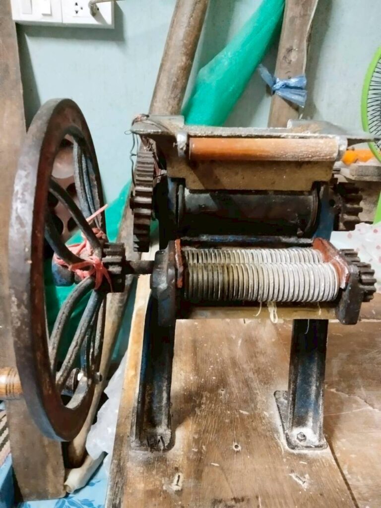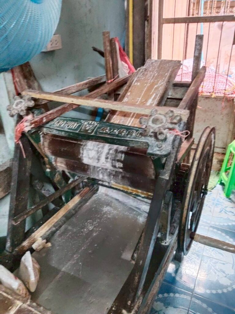 - เครื่องรีดแป้ง จะมีลักษณะคล้ายกับจักรรีดยาง (แผ่นเรียบ) ต้องมี 2 คนช่วยกันในขณะทำ คือ คนส่งแป้งและคนหมุนจักร