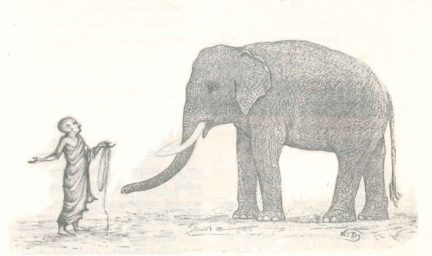 เมื่อช้างเดินทางมาพบกับสามเณรน้อยรูปนี้เข้า มันจึงได้ถามสามเณรขึ้นว่า “นี่แน่ะเจ้าเณรน้อย ท่านรู้จักพระอุชเชนทร์ไหมล่ะ” สามเณรน้อยรูปนั้นจึงได้ตอบช้างไปว่ารู้จักดี ช้างก็ได้ไต่ถามต่อไปว่า พระอุชเชนทร์ที่ว่านั้นอยู่ที่ไหน จะไปพบได้อย่างไร ฯลฯ สามเณรจึงได้ชี้แจงว่าต้องใช้เวลาในการเดินทางถึง 15 วัน จึงจะไปถึงที่อยู่ของพระอุชเชนทร์ แต่ถ้าเหาะไปก็คงใช้เวลาเพียงวันเดียวก็ไปถึง สามเณรน้อยรูปนั้นได้กล่าวกับช้างอีกว่า “เอาเถอะถ้าท่านอยากจะพบกับพระอุชเชนทร์จริงๆ แล้ว เรานี่แหละจะนำไป แต่ทว่าท่านต้องยอมให้เราขี่คอท่านไปด้วย เพราะว่าเราไม่สามารถเดินทางด้วยเท้าได้ถึง 15 วันดอก และก็ต้องอาเชือกมาผูกคอของท่านไว้ด้วยสำหรับไว้ให้เรายึดถือ เพราะว่าเรากลัวตกจากคอของท่าน ว่าไง ตกลงไหม” ช้างนั้นก็ยอมตกลงโดยดี เพราะว่ามันอยากจะรีบไปฆ่าพระอุชเชนทร์ให้ตายๆ ไป ให้รู้แล้วรู้รอดเสียที