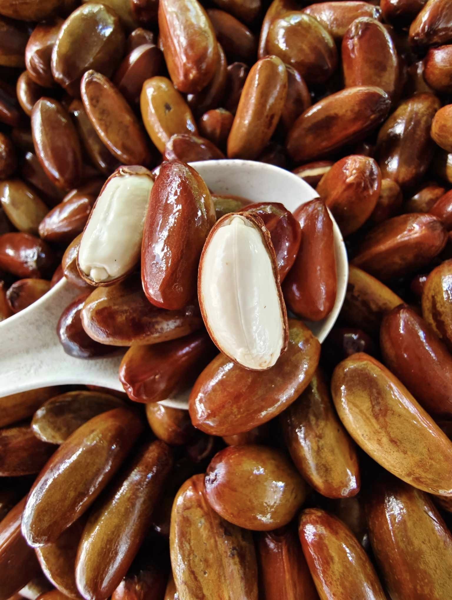 - ลูกประสดแกะเปลือกออก หั่นเป็นแว่นบาง ๆ คั่วจนเหลืองกรอบ