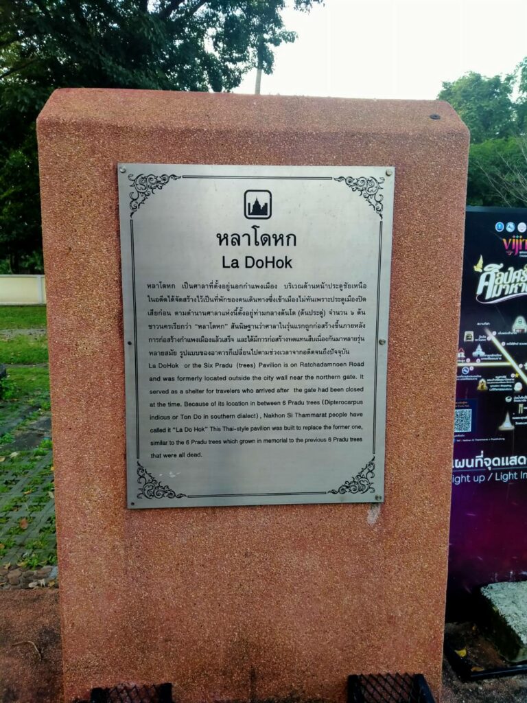 แต่เดิมนั้นมีต้นประดู่อยู่เต็มรายรอบศาลา มีอยู่หกต้นจริง เลยหมายตาเอาง่ายๆ ว่า หลาที่มีต้นโดหกต้น เรียก “หลาโดหก” ตามสไตล์คนใต้ไม่ชอบพูดยาว ตัดๆ คำเอาพอเข้าใจ เราคนเมืองปราชญ์นครศรีธรรมราชก็เข้าใจง่ายกันอยู่แล้ว