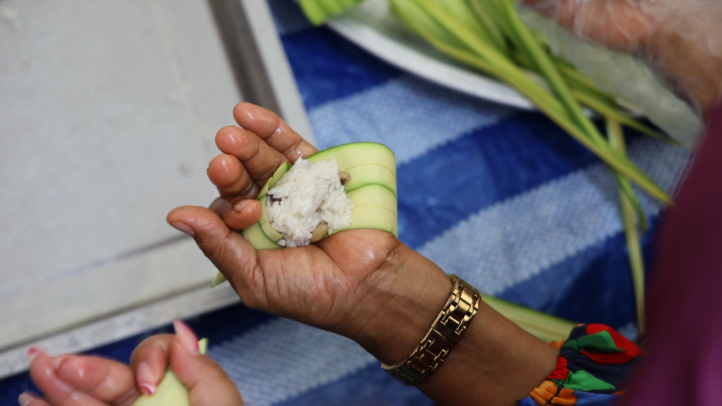 1.ขั้นตอนการเตรียมใบกะพ้อ โดยการไปตัดใบกะพ้อ เมื่อได้มาแล้วก็นำใบกะพ้อมาตากแดด และคลี่เพื่อเตรียมการห่อ ซึ่งในอดีตใบกะพ้อมีมาก หาได้ง่าย ไม่ต้องซื้อ