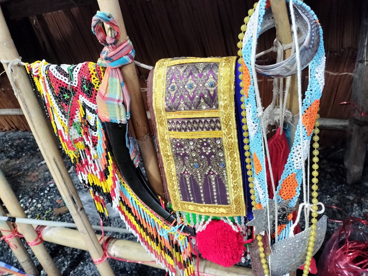 - ผ้าประดับเทริด: นิยมใช้ผ้าไหมสีต่างๆ เช่น สีทอง สีเงิน สีแดง สีเขียว หมายถึงความสวยงาม อ่อนหวาน