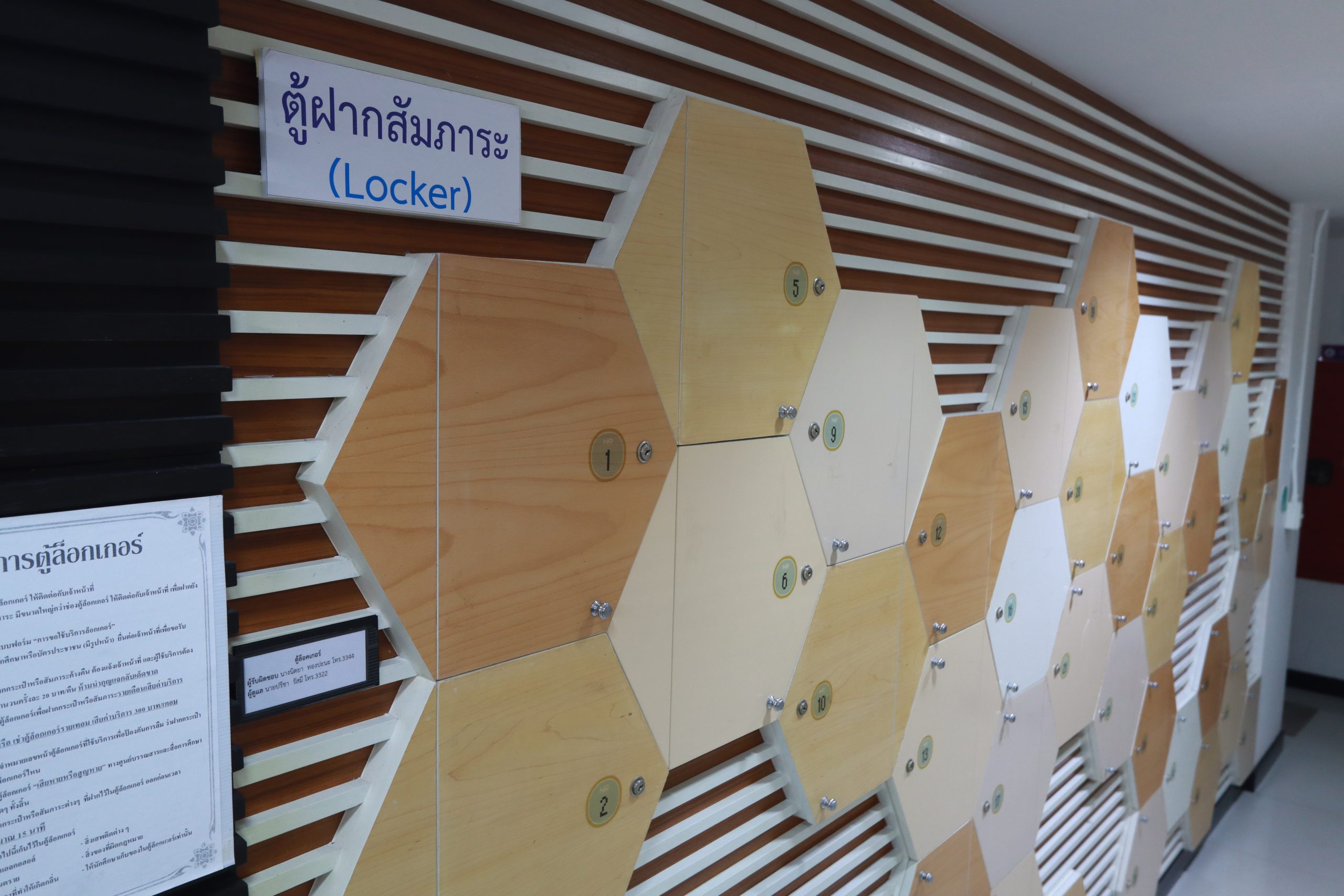 - ผู้ใช้บริการสามารถเช่าตู้ล็อกเกอร์เพื่อฝากสิ่งของสัมภาระ เป็นรายเดือน โดยเสียค่าบริการ 100 บาท/เดือน หรือเช่าเป็นภาคการศึกษา ค่าบริการ 300 บาท/ภาคการศึกษา