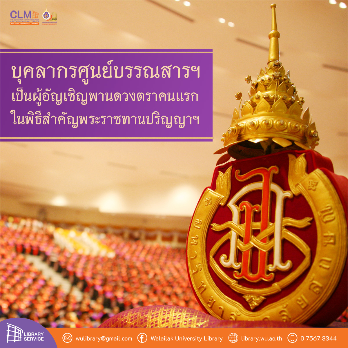 บุคลากรศูนย์บรรณสารฯ เป็นผู้อัญเชิญพานดวงตราคนแรก ในพิธีสำคัญพระราชทานปริญญาฯ