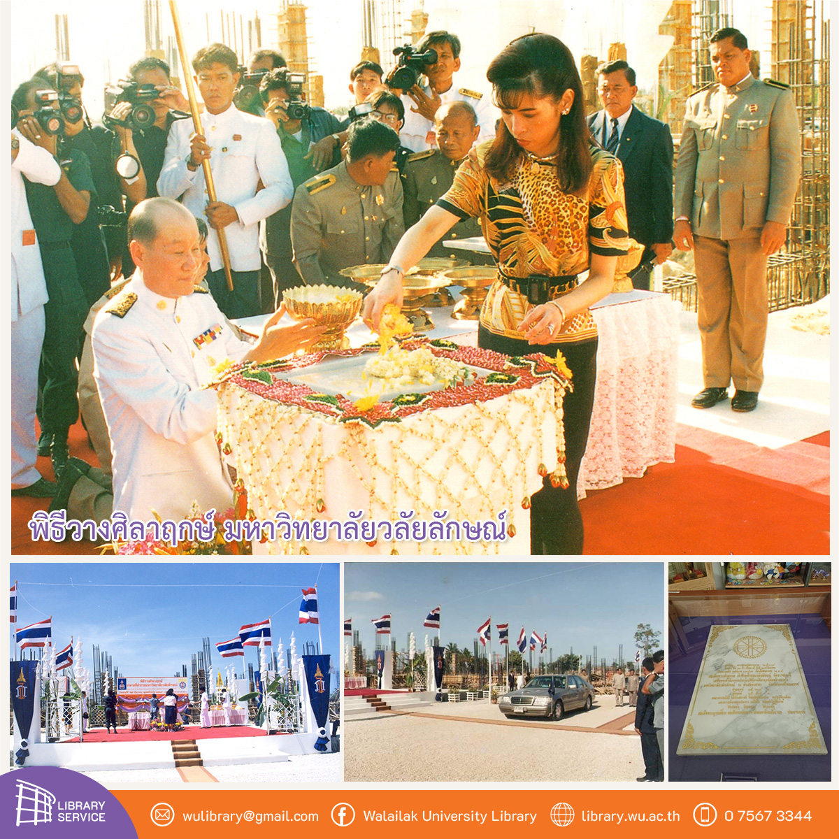 มหาวิทยาลัยวลัยลักษณ์ จัดพิธีวางศิลาฤกษ์การก่อสร้างมหาวิทยาลัยวลัยลักษณ์ เมื่อวันศุกร์ที่ 29 มีนาคม พ.ศ. 2539 เวลา 15.29-15.49 น. โดยสมเด็จพระเจ้าน้องนางเธอ เจ้าฟ้าจุฬาภรณวลัยลักษณ์ อัครราชกุมารี กรมพระศรีสวางควัฒน วรขัตติยราชนารี เสด็จพระดำเนินเป็นองค์ประธานในพิธีวางศิลาฤกษ์ อาคารมหาวิทยาลัยวลัยลักษณ์ ณ พื้นที่ก่อสร้างอาคารบรรณสารและสื่อการศึกษา เป็นปะรำพิธี (เนื่องจากห้องสมุดเป็นหัวใจของการศึกษา อาคารบรรณสารฯ อยู่ใจกลางมหาวิทยาลัยวลัยลักษณ์) และมีการฝังแผ่นศิลาฤกษ์ในบริเวณดังกล่าว ซึ่งปัจจุบันคือเสาแรกติดบันไดทางขึ้นอาคารบรรณสารชั้น 2 หน้าร้านกาแฟเทอเรซ บริษัท สำนักงาน องค์กรใหญ่บางแห่งจะมีการฝังแผ่นศิลาฤกษ์ไว้ในผนังอาคาร หรือ ติดตั้งแท่นประดิษฐานไว้ในจุดที่ผู้คนเดินผ่านสัญจร เพื่อเป็น Lanmark สำหรับมหาวิทยาลัยวลัยลักษณ์ ได้มีจัดเก็บแผ่นศิลาฤกษ์จำลอง ไว้ในหอจดหมายเหตุมหาวิทยาลัยวลัยลักษณ์ ซึ่งมีแผ่นพิธีเปิดมหาวิทยาลัยวลัยลักษณ์เมื่อวันที่ 3 กรกฎาคม 2553 อยู่ด้วย