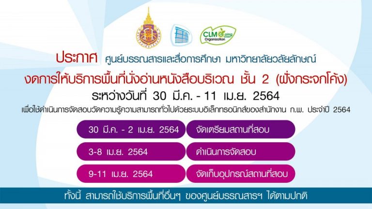 งดบริการพื้นที่นั่งอ่าน ชั้น 2 เพื่อสอบเพื่อวัดความรู้ความสามารถทั่วไป (ก.พ.) ด้วยระบบ